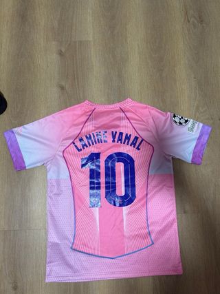 Camiseta de fútbol rosa con detalles en azul y blanco. Presenta el logo de Nike y el logo de Spotify. - (Escudo tapado para que no lo quiten) - Logo de Nike en el pecho. - Logo de Spotify en el centro. - Detalle 90 en la parte inferior izquierda
