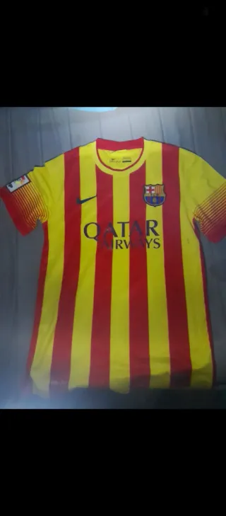 Camiseta de fútbol FC Barcelona con el diseño clásico de rayas verticales. - Diseño a rayas rojas y amarillas. - Logo de Nike. - Patrocinador Qatar Airways. Espero oferta