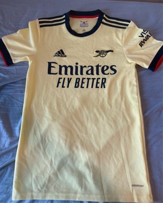 Camiseta de fútbol del Arsenal de la marca Adidas. - Diseño en color amarillo. - Detalles en azul marino y rojo en cuello y mangas. - Logo de Adidas y escudo del club. - Inscripción Emirates Fly Better en el frontal. - Tecnología Aeroready.