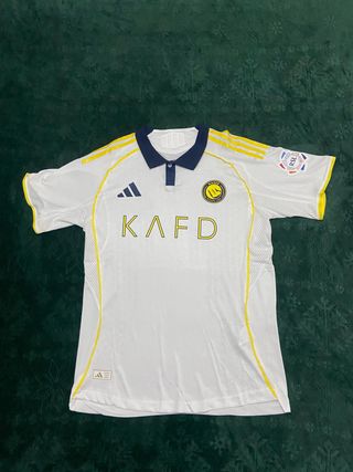 Camiseta de fútbol Al Nassr. - Diseño blanco con detalles amarillos. - Cuello tipo polo con botones. - Logo de Adidas en el pecho. - Escudo del equipo. - Inscripción KAFD en el frontal.