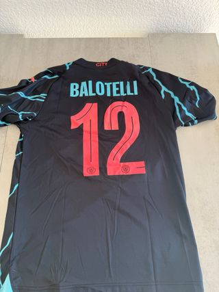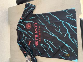 Camiseta de fútbol del Manchester City en talla M. Diseño moderno con estampado. - Color principal negro. - Estampado de líneas azul claro. - Logo del club y patrocinador en color coral. - Manga larga.
