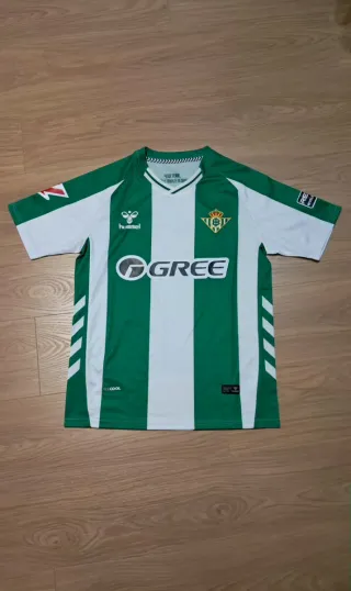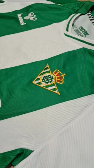 Camiseta de fútbol del Betis para la temporada 2025/2026. - Diseño a rayas verdes y blancas. - Logo de Hummel en el pecho. - Patrocinador principal visible en la parte frontal. - Esta en perfecto estado, nunca usada.