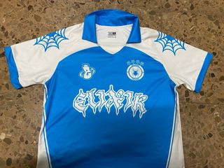 Camiseta de fútbol de la marca Elixir con un diseño llamativo. - Diseño con detalles de telaraña en las mangas. - Logo circular con una araña en el pecho. - Gráfico frontal con el nombre de la marca.