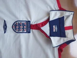 Camiseta de fútbol retro de Inglaterra 98, Dorsal 7. - Diseño icónico de Umbro. - Detalles en rojo y azul. - Manga larga.