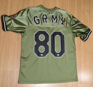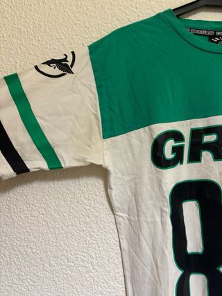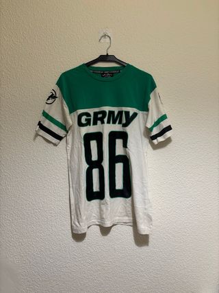Camiseta de la marca GRIMEY con diseño deportivo. - Diseño de bloques de color verde y blanco. - Número 86 grande en la parte delantera. - Detalles de rayas en las mangas. - Talla xs, pero bastante grande. - Tiene marcas amarillas, único inconventiente. - Unisex.