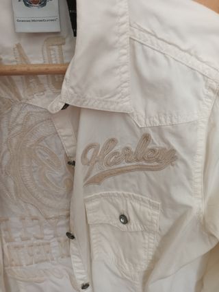Camisa de manga larga con un diseño clásico de Harley-Davidson. - Cuello camisero. - Cierre de botones. - Bolsillo en el pecho. - Estampado gráfico en la parte delantera. Camiseta prácticamente nueva,pero en el hombro izquierdo hay unas pequeñas manchas. Son apenas visibles.