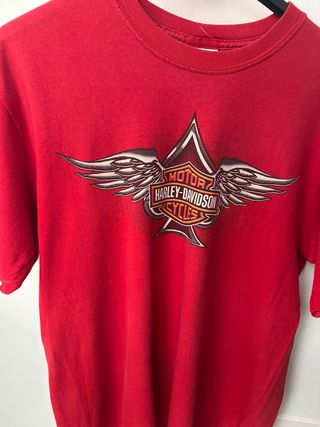 Camiseta clásica de Harley-Davidson con un diseño icónico. - Logo de Harley-Davidson en el pecho. - Cuello redondo. - Manga corta. - Alguna mancha que no soy capaz de quitar (la lavadora)