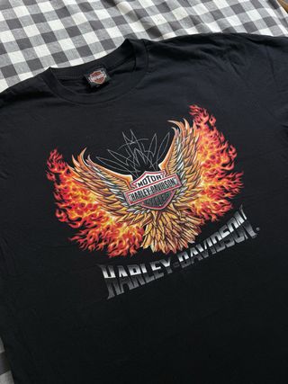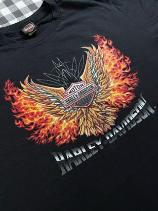 Camiseta negra con un llamativo diseño gráfico de Harley-Davidson. - Estampado frontal con alas de fuego y el icónico logo de la marca. - Detalle del nombre de la marca en la parte inferior del diseño.