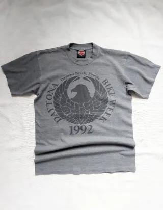 True vintage gem! Original Harley Davidson T Shirt with a single stitch from 1992. Daytona Bike Week 1992. Marion County, Ocala, Florida. Great heather grey wash and old school cotton. 100% cotton. Size M Model is 180 cm tall, size S-M. Pit to pit 50 cm Bottom width 52,5 cm Length 70 cm In very good vintage condition, no defects or major signs of wear. Camiseta vintage de Harley Davidson de 1992. - Diseño con águila y Daytona Beach Bike Week. - Costura sencilla (single stitch). - Color gris jaspeado.