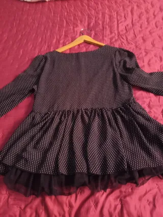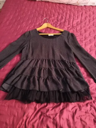 Camisa de primavera con un diseño de lunares y pequeños volantes. Cuello redondo Cremallera trasera Comprada en el CI Pinzas femeninas, perfecta para mayas o tejanos negros - Mangas largas. - Detalle de volantes en la parte inferior. - Tejido ligero.
