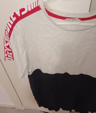 Camiseta corta para hombre con un diseño moderno y llamativo. - Diseño bicolor con blanco en la parte superior y negro en la inferior. - Detalles de banda roja con texto en las mangas y cuello.