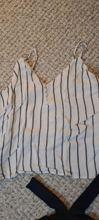 Preciosa camiseta de rayas verticales de la marca HM. Es de color negro y tiene un diseño elegante y moderno. - Talla: (Añadir talla) - Tejido suave y agradable al tacto - Corte recto