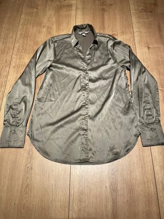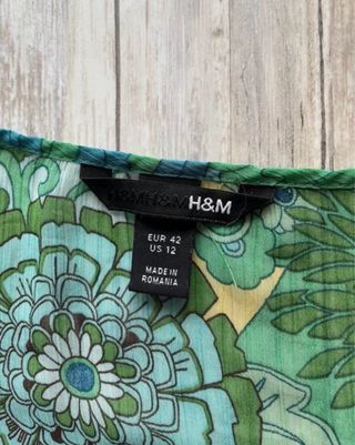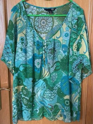 Elegante blusa de la marca HM, talla 42. Es una prenda preciosa, con un estampado floral en tonos verdes y azules. - Manga corta. - Tejido ligero y fluido. La blusa está en perfecto estado es de color verde tiene distintos tipos de verde , la blusa está tal cual sale en las fotos , las medidas están en las fotos , más ropa en mi perfil hago descuento dependiendo de lo que compren , se puede hacer un lote o pack de ropa para pagar un solo envío , preguntar sin compromiso