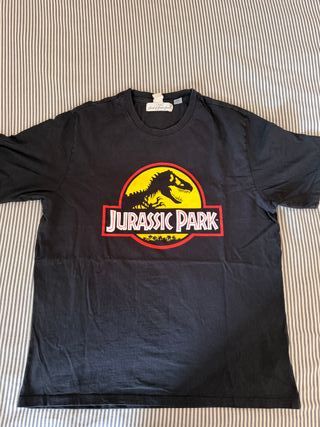 Camiseta negra con el icónico logo de Jurassic Park. - Diseño frontal con dinosaurio y texto. - Cuello redondo y manga corta. - Tejido de algodón suave.
