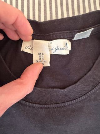 Camiseta de BILLIE EILISH de la marca H&M. Color gris muy oscuro casi negro. Talla XS. Ha tenido poco uso, pero tiene una marca horizontal de haberla tendido para secar y que le haya tocado un poco el sol (ver foto 4.)