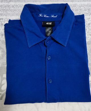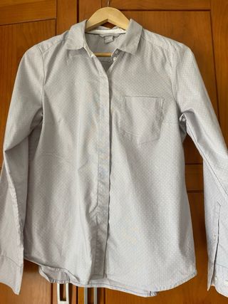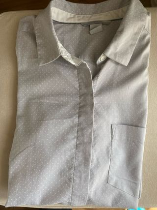 camisa coblor gris muy clarito con lunaritos pwqueños, talla 42 de HM, tela un poco elastica muy comoda