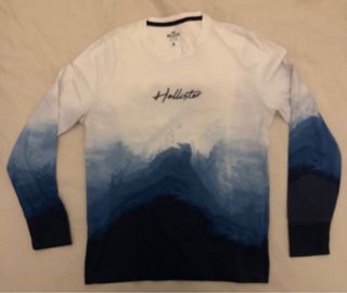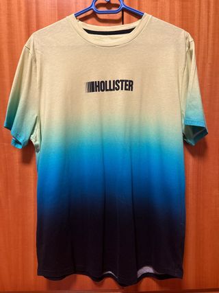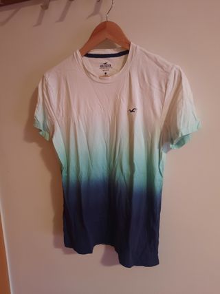 Preciosa camiseta de la marca Hollister. Tiene un diseño degradado que va del azul turquesa a un azul marino oscuro. Es una prenda cómoda y suave al tacto, ideal para el día a día. - Talla S