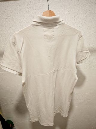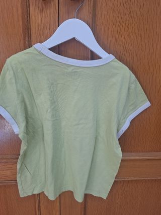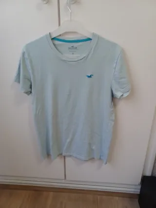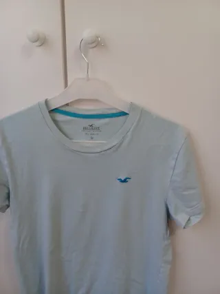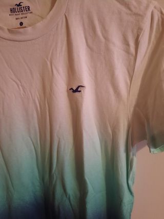 Camiseta de la marca Hollister. El color por la parte de arriba es de color verde muy suave. En la foto no se aprecia bien y parece de color blanco. Talla S.