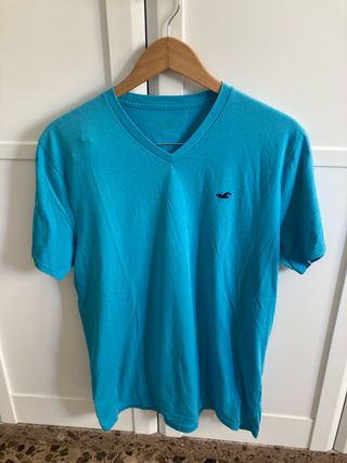 Preciosa camiseta de la marca Hollister, en color turquesa. Es una prenda de vestir muy cómoda y suave al tacto. - Talla: L - Corte: clásico en pico - Tejido: algodón