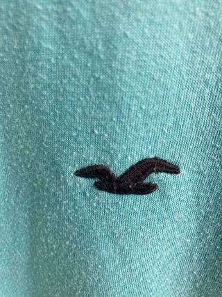 camista corta de holliser de manga corta Es talla L pero talla pequeña como una S color verde azulado y letras en el centro no usada casi