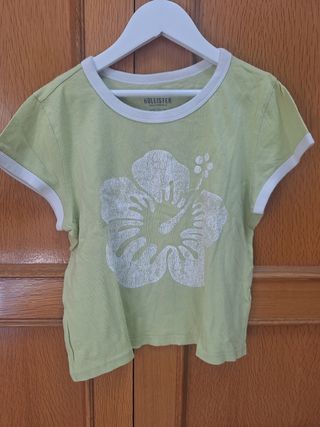 Preciosa camiseta de Hollister en color verde claro. Es de manga corta y tiene un bonito estampado de una flor. Está en perfecto estado. - Talla S (equivalente a una 34-36 o 44-46) - Corte cropped - Diseño con detalle de hibiscus