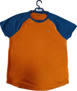 Camiseta de manga corta con diseño raglán. - Cuerpo principal en color naranja jaspeado. - Mangas y cuello en contraste azul marino. - Pequeño logo de Hollister bordado en el pecho.
