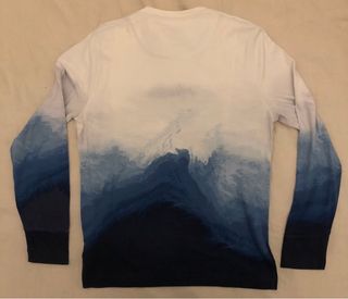 Camiseta de manga larga con un diseño degradado en tonos azules y blancos. - Estampado abstracto en la parte frontal y mangas. - Cuello redondo. - Puños y bajo en azul marino en forma degradada.