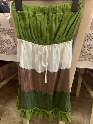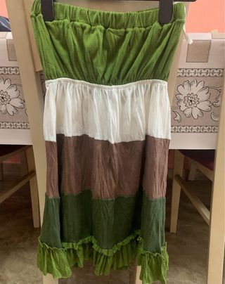 Camiseta de palabra de honor con un diseño de bloques de color. La parte superior elástica. Tiene la decorativo por debajo del pecho. Sin marca talla M