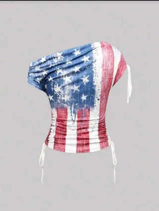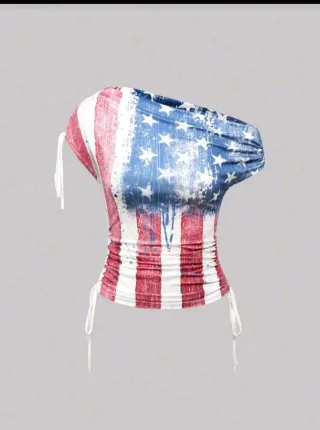 Camiseta con un diseño llamativo inspirado en la bandera de Estados Unidos. Es una prenda nueva, sin estrenar. - Diseño de la bandera americana con efecto desgastado. - Corte asimétrico con un hombro descubierto. - Detalle de cordones ajustables a los lados. - Tejido elástico y fruncido en los laterales. - Conserva la etiqueta. - Precio negociable.