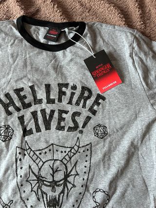 Camiseta gris con estampado Hellfire Lives inspirado en Stranger Things. - Diseño con escudo, calavera y espadas. - Cuello y mangas con ribete negro. - Nuevo con Etiqueta original incluida.