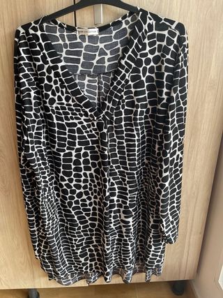 Blusa de manga larga con un llamativo estampado. - Diseño con cuello en V. - Estampado de animal print en blanco y negro. - Corte holgado y cómodo, tejido de punto elástico. Medidas hombros 54cm, pecho 68 cm, largo 76 cm y manga 57 cm.