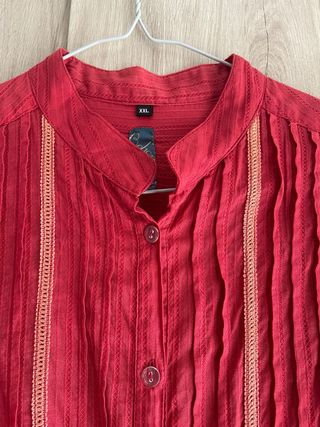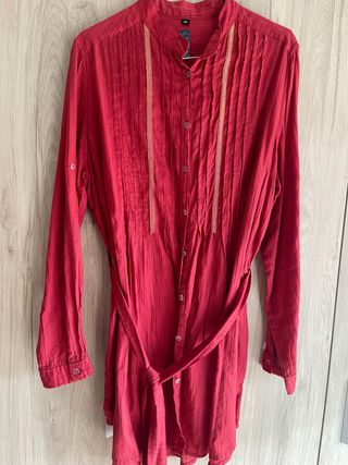 Camisa larga de color rojo con cinturón. - Diseño con cuello mao. - Cierre de botones. - Detalle de tiras decorativas en la parte frontal. - Mangas largas con puños abotonados. medidas hombros 44 cm, pecho 56 cm , manga 63 cm y largo 86 cm Tejido de algodón