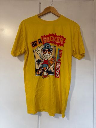 Camiseta de manga corta con un diseño gráfico llamativo. - Estampado frontal con personaje y texto. - Cuello redondo.