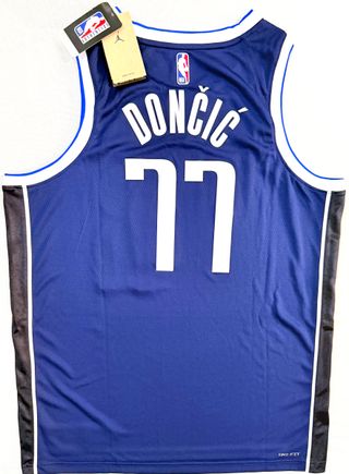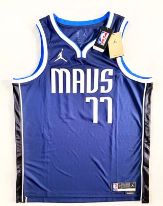 Camiseta de baloncesto Jordan de los Dallas Mavericks. - Diseño con el número 77. - Logo de Jordan en blanco. - Ribetes en azul y negro.