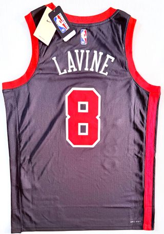Camiseta de baloncesto de los Chicago Bulls con el número 8. - Diseño con el nombre CHICAGO en vertical. - Detalles en rojo y logo de Nike. - Inscripción MADHOUSE ON MADISON en la parte inferior. - Etiqueta de autenticidad NBA