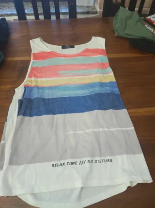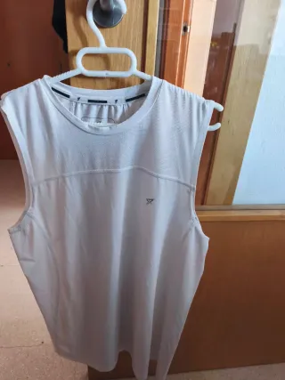 Camiseta básica de tirantes en color blanco. - Cuello redondo. - Tejido suave y cómodo. La prenda está en buen estado, el precio es para que puedas crear tu lote. 3 por 2 en ropa y bolsos! (te regalo el de menor precio)