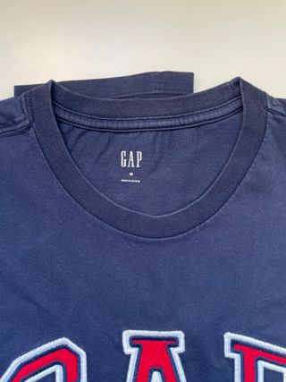 Lote de dos camisetas de manga corta de la marca GAP. Ambas son de talla M y presentan el logo de la marca bordado en la parte delantera. Camiseta de color crudo con logo GAP bordado en rojo y negro. Camiseta azul marino con logo GAP bordado en rojo y blanco.