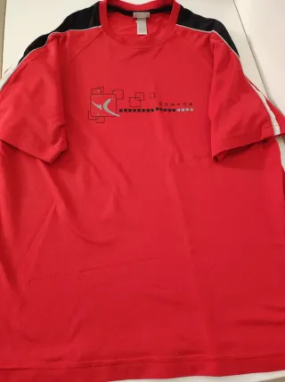 Camiseta deportiva Domyos de color rojo, diseñada para ser transpirable. - Tejido ligero y cómodo. - Cuello redondo. - Mangas cortas. - Detalle de estampado geométrico en la parte inferior. - Logo de la marca en la parte frontal. La prenda está en buen estado, el precio es para que puedas crear tu lote. 3 por 2 en ropa y bolsos! (te regalo el de menor precio)