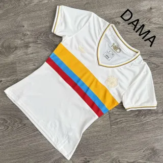Camiseta deportiva con diseño inspirado en los colores de Colombia. - Diseño de rayas diagonales en amarillo, azul y rojo. - Cuello en V con detalles de ribetes. - Logo de Adidas bordado. - Escudo de la selección bordado.