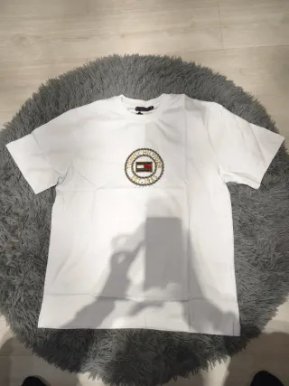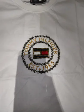 Camiseta de manga corta de la marca Tommy Hilfiger. - Talla L - Diseño con logo circular bordado en la parte frontal. - Cuello redondo.