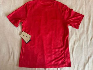 Camiseta Asics Roja con Rayas Negras y azul nike.