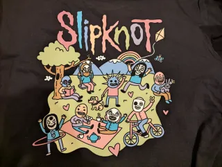 Camiseta negra con el logo de Slipknot. Impresión delante y detras - Diseño con letras de colores. - Incluye un pequeño dibujo de una cometa.