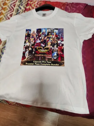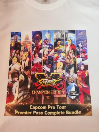 Camiseta blanca con diseño de Street Fighter Champion Edition. - Ilustración de personajes de Street Fighter. - Incluye logo de Capcom Pro Tour. disponible en blanco negro o azul tallas l blanco l azul l XI negro también en negro tejido técnico talla l 100% algodon