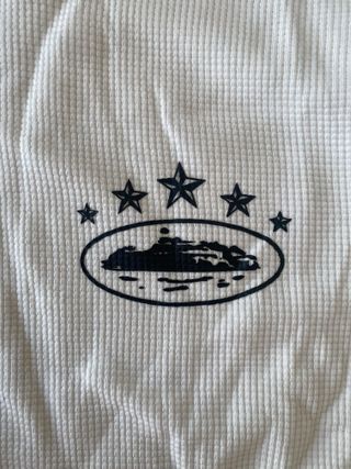 Camiseta de manga corta con un diseño original. - Tejido de algodón con textura. - Estampado de estrellas y un paisaje en un óvalo. Camiseta de manga larga en color blanco, talla S. Tejido tipo waffle/termal, ideal para entretiempo o para llevar como capa interior en invierno. Cuello redondo y puños ajustados para mayor comodidad. Detalle bordado en el pecho con diseño de estrellas y barco en color negro, discreto y original. Corte recto, cómoda y fácil de combinar. Medidas: - Pecho busto: 107 cm - Manga:64 cm Si tienes alguna duda consúltame!!