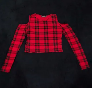 Camiseta de manga larga con hombros descubiertos con estampado de cuadros en rojo y negro. - Diseño con hombros descubiertos. - Cuello redondo. - Manga larga. - Talla S.
