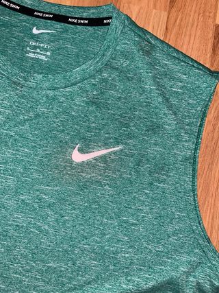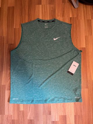 Camiseta deportiva Nike de color verde con un degradado hacia el turquesa en la parte inferior. Ideal para correr o entrenar. - Tejido ligero y transpirable. - Diseño sin mangas. - Logo de Nike en blanco.