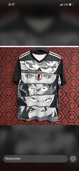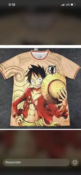 Camiseta con diseño del personaje Luffy de One Piece y el escudo de Japón. - Diseño frontal de Luffy. - Escudo de Japón en la manga. - Detalles de nubes y ondas. - Cuello redondo con ribete rojo. - Mangas cortas con ribete rojo.
