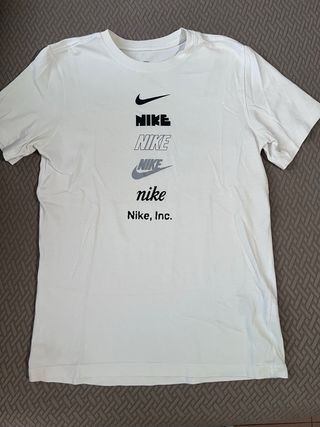 ¡Para auténticos fans de Nike! Vendo camiseta original Nike Sportswear en color blanco. Lo que la hace especial es su diseño frontal con la progresión de los diferentes logos e tipografías icónicas de la marca. La prenda está en muy buen estado, el blanco se mantiene brillante y los estampados están impecables. Características: • Diseño: Gráfico vertical "Multi-Logo" que incluye el Swoosh, logos retro y la firma "Nike, Inc.". • Tejido: Algodón ligero y cómodo, ideal para verano. Envío rápido por Wallapop o entrega en mano en Badalona. ¡Si te llevas el pantalón corto Nike de mi perfil, te hago precio especial por el conjunto!