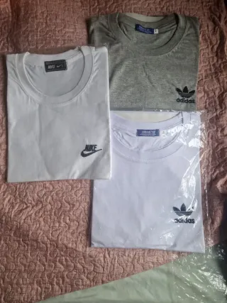 Conjunto de tres camisetas deportivas. - Dos camisetas de la marca Nike. - Una camiseta de la marca Adidas. - Colores disponibles: blanco y gris.