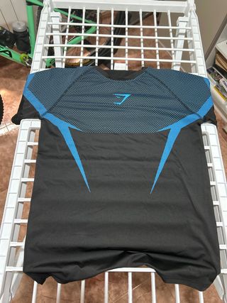 Camiseta deportiva Gymshark con un diseño moderno. Talla M - Más camisetas en mi perfil - Tejido técnico transpirable. - Detalle de logo en azul. - Paneles de malla en la zona superior.